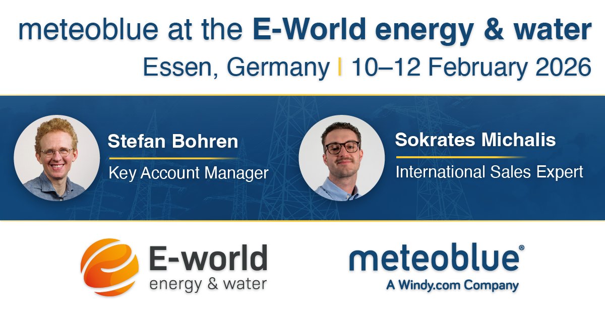 Die E-world ist seit Jahren ein fester Termin im Kalender von meteoblue. Jährlich reisen wir nach Essen, um uns mit den Innovatoren der europäischen Energielandschaft auszutauschen und zu zeigen, wie hochpräzise meteorologische Daten eine zentrale Säule der globalen Energiewende bleiben. Wir freuen uns, dass unsere Kollegen Stefan Bohren und Sokrates Michalis dieses Jahr vor Ort sein werden, um unser Unternehmen zu vertreten und den fachlichen Austausch zu bereichern.