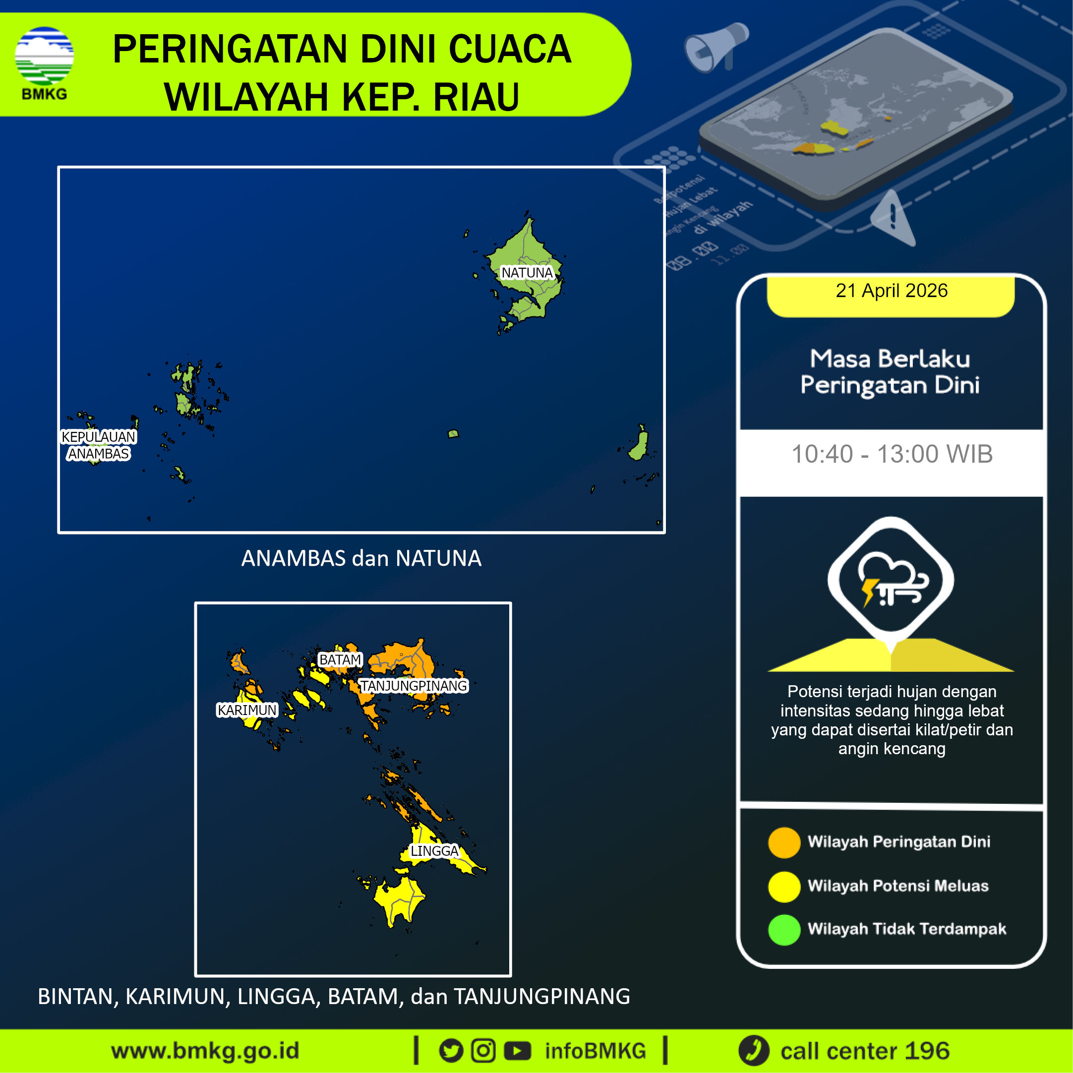 Thunderstorms and heavy rainfall are forecasted to occur starting from 21 April 2026, 10:40 WIB in parts of Kep. Riau especially in: Batam Kota, Batu Aji, Bintan Pesisir, Bintan Timur, Bintan Utara, Buru, Durai, Galang, Gunung Kijang, Karimun, Lubuk Baja, Mantang, Meral, Meral Barat, Nongsa, Sagulung, Sei Beduk, Sekupang, Senayang, Seri Kuala Lobam, Tanjung Pinang Timur, Tebing, Telok Sebong, Teluk Bintan, Toapaya. These conditions may lead to reduced visibility, strong winds, and localized flooding. The public is strongly advised to remain vigilant during this period, limit outdoor activities, and take all necessary precautions to ensure safety. Conditions are expected to gradually improve by 21 April 2026, 13:00 WIB.