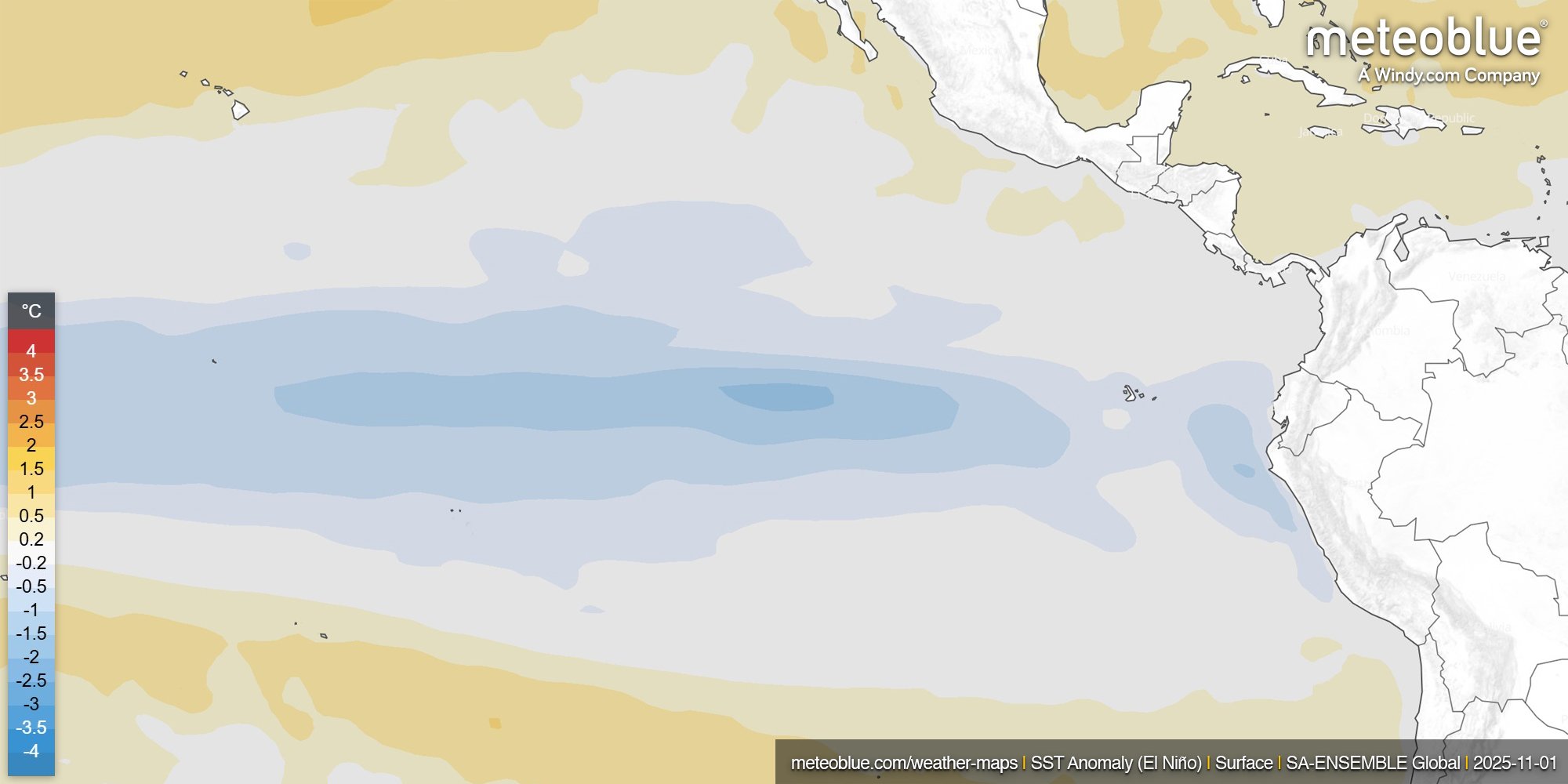 Sea Surface Temperature Anomaly Map for November 2025 (meteoblue.com). The map shows how much the ocean's temperature at the surface differs from its long-term average. Areas with warmer-than-average temperatures are coloured in shades of yellow and bright orange, while cooler-than-average areas are depicted in blue. This map features forecasted La Niña conditions in the Pacific Ocean for November 2025.