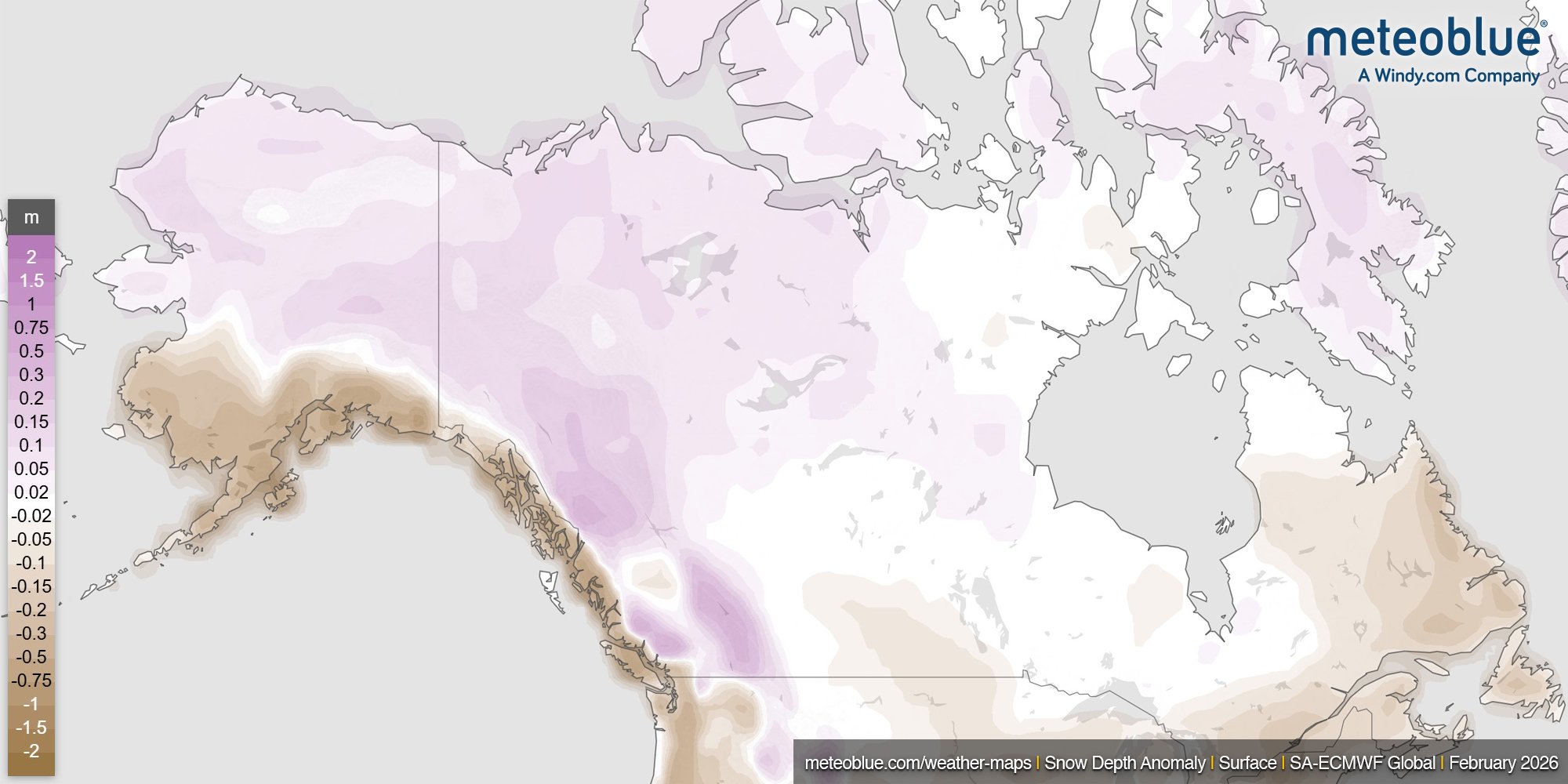 Snow Depth Anomaly Map for February 2026 (meteoblue.com). The map shows how forecasted snow depth differs from the long-term average (the "climatological norm") for a given period.