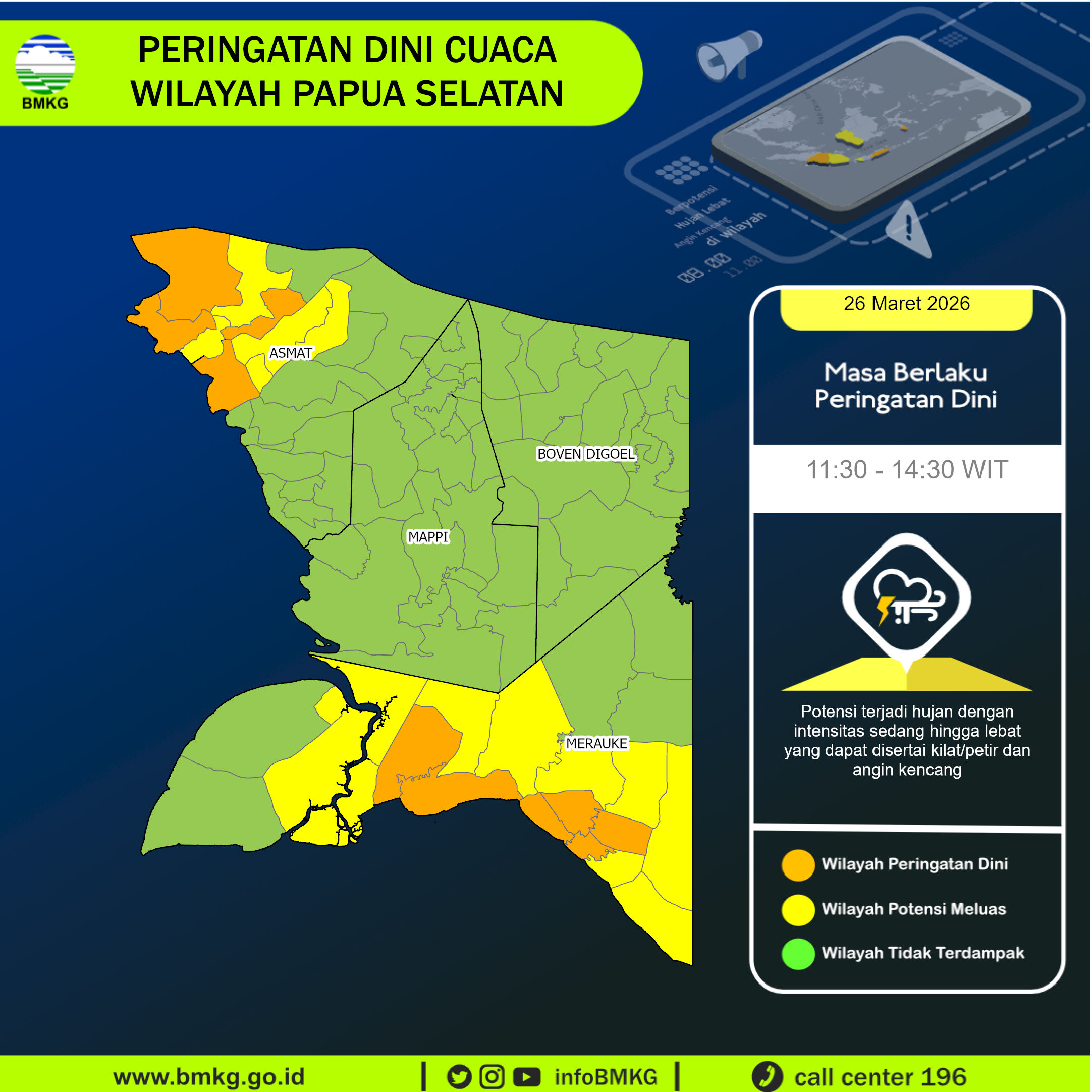 On Thursday there is a chance of thunderstorms and local showers. The sun will not be visible. The chance of precipitation is moderate or near 50%. Temperatures peaking at 85 °F. With UV-Index rising to 12, sun protection is strongly recommended. During the night and in the morning light air is noticeable (1 to 4 mph). In the afternoon blows a light breeze (4 to 8 mph). Winds blowing overnight from East, in the morning from Northeast and during the afternoon from Southwest. The weather forecast for Agats for Thursday can be accurate in parts but deviations are expected. Check again for latest updates.