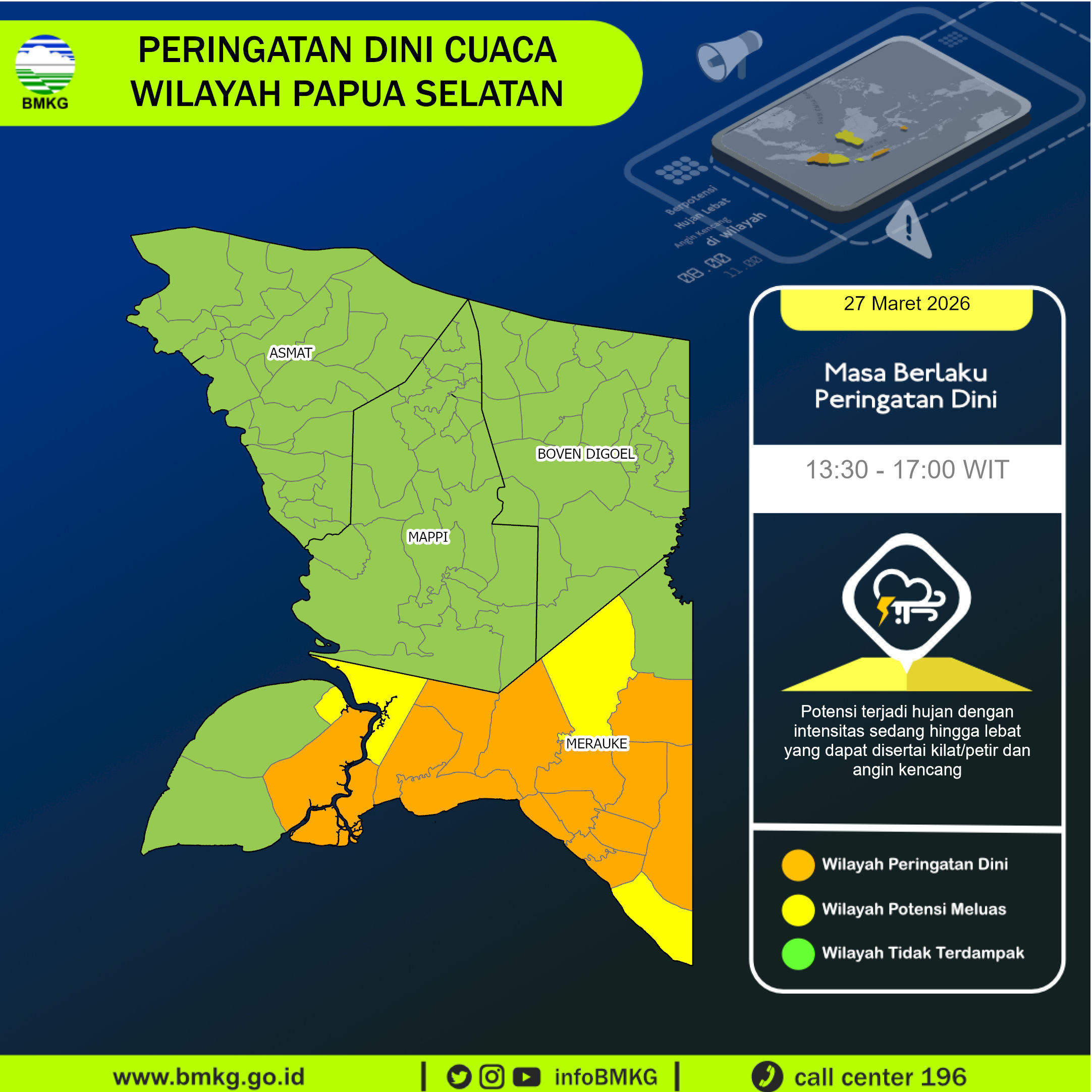 Thunderstorms and heavy rainfall are forecasted to occur starting from 27 March 2026, 13:30 WIT in parts of Papua Selatan especially in: Animha, Elikobal, Jagebob, Kaptel, Kimaam, Kurik, Malind, Merauke, Ngguti, Okaba, Semangga, Sota, Tanah Miring, Tubang. These conditions may lead to reduced visibility, strong winds, and localized flooding. The public is strongly advised to remain vigilant during this period, limit outdoor activities, and take all necessary precautions to ensure safety. Conditions are expected to gradually improve by 27 March 2026, 17:00 WIT.