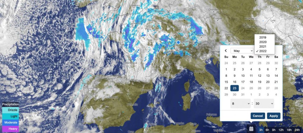 meteoblue launched unique historical satellite cloud maps available since December 2019 - worldwide and in the highest available precision - the first of its kind worldwide. The satellite history for the past week is available free of charge. The whole satellite history is part of our point+ subscription, which you can also test for 2 weeks without any obligations.