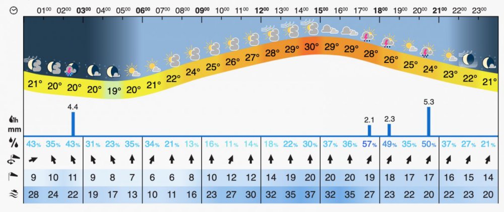 Our hourly weather overview was re-designed as a temperature arch, summarising hourly weather information in a curve decorated by colours, weather symbols, and daylight time. You can see the hourly weather view directly on our start page with the extended view. We have also added a line that shows the current time for rapid orientation during the day - and of course, all data are continuously updated with the most recent measurements and observations.