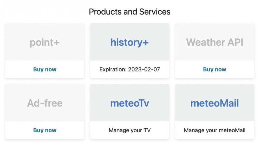 The new website account page shows a better overview of available services and simplifies the management of meteoblue subscriptions like point+ or Ad-free. This page is only accessible to users with an account on our website.