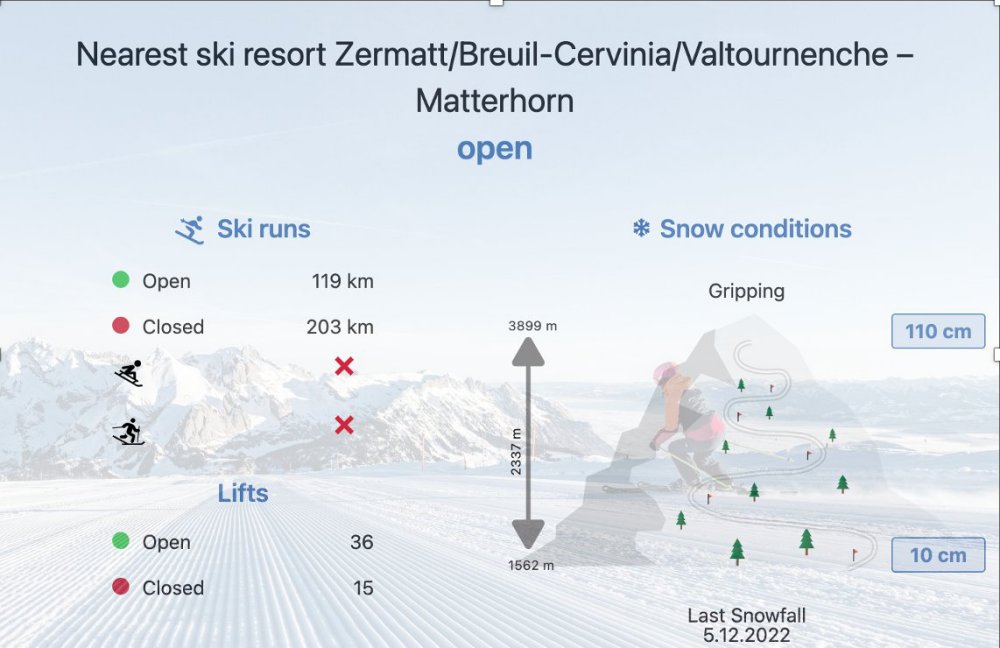 We have been working on our new ski resort weather to prepare for the starting skiing season in the Northern hemisphere. The ski resort information has been added to our start page, where you can immediately see if there is a ski resort in the nearby surrounding of the selected location. If so, an additional box appears summarising the most relevant ski information. By clicking on this box to find detailed information on all slopes and infrastructure in the ski resort, up-to-date information on open ski runs and lifts, as well as snow conditions. On our new page, you can also find all relevant contact information and website links to each ski resort.