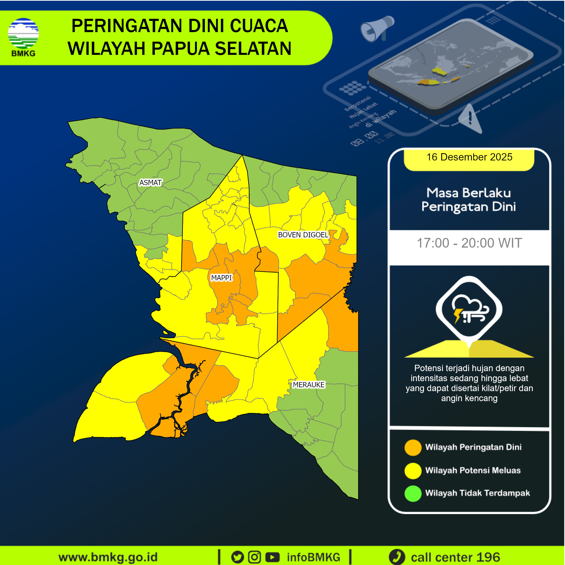 Thunderstorms and heavy rainfall are forecasted to occur starting from 16 December 2025, 13:42 WIT in parts of Papua Selatan especially in: Animha, Jagebob, Kimaam, Kurik, Obaa, Okaba, Sota. These conditions may lead to reduced visibility, strong winds, and localized flooding. The public is strongly advised to remain vigilant during this period, limit outdoor activities, and take all necessary precautions to ensure safety. Conditions are expected to gradually improve by 16 December 2025, 16:30 WIT.