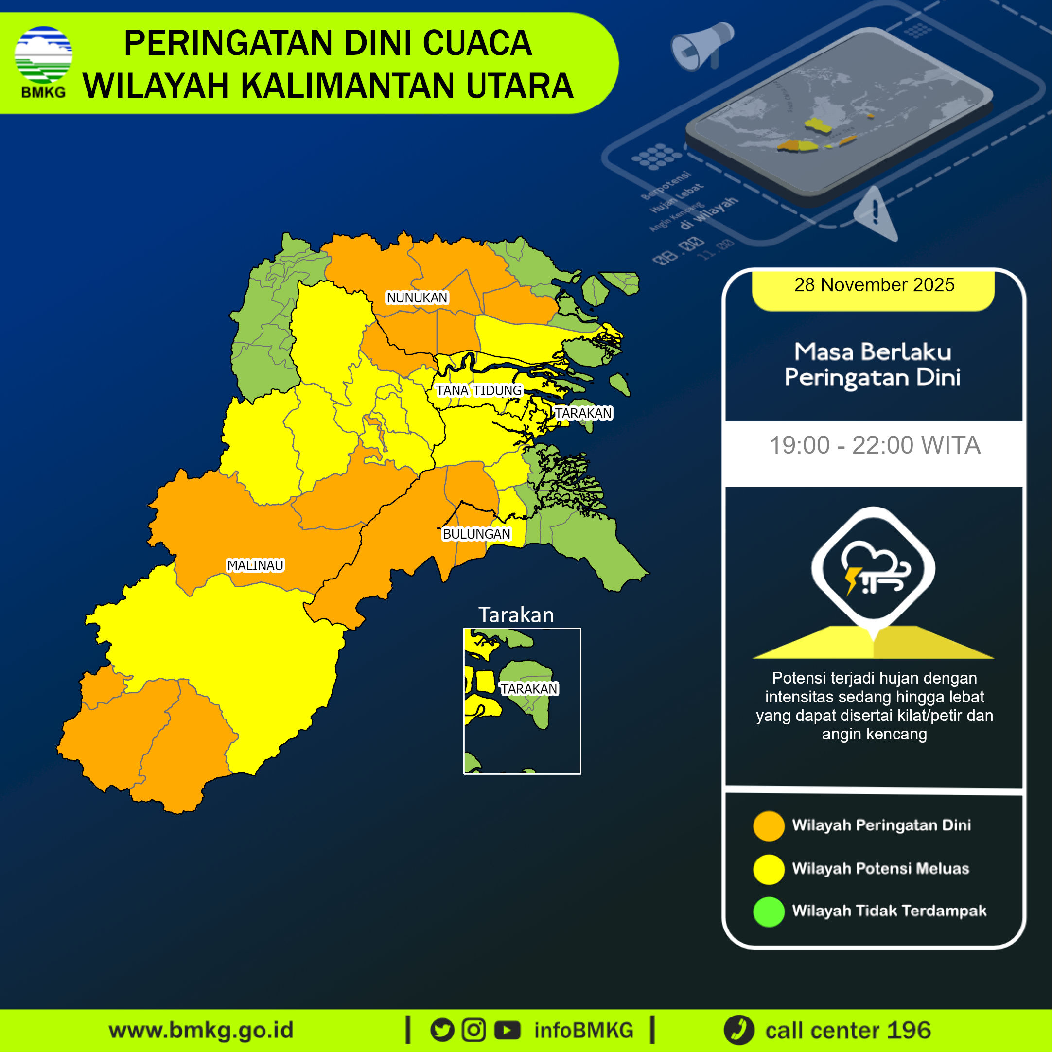 Thunderstorms and heavy rainfall are forecasted to occur starting from 28 November 2025, 19:00 WITA in parts of Kalimantan Utara especially in: Kayan Hulu, Kayan Selatan, Lumbis, Lumbis Ogong, Malinau Selatan Hulu, Malinau Utara, Peso, Peso Hilir, Pujungan, Sebuku, Sembakung Atulai, Sungai Boh, Tulin Onsoi. These conditions may lead to reduced visibility, strong winds, and localized flooding. The public is strongly advised to remain vigilant during this period, limit outdoor activities, and take all necessary precautions to ensure safety. Conditions are expected to gradually improve by 28 November 2025, 22:00 WITA.