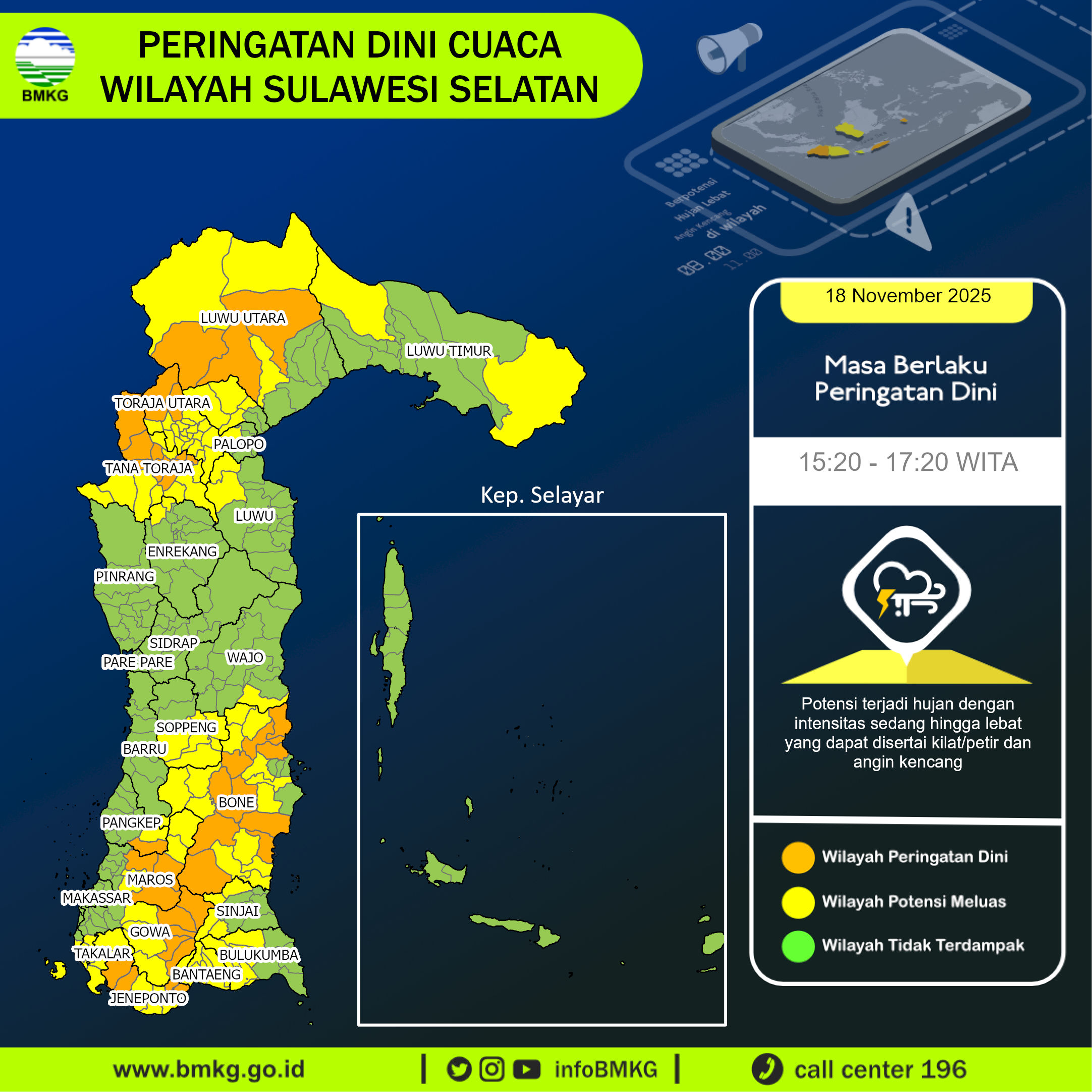 Thunderstorms and heavy rainfall are forecasted to occur starting from 18 November 2025, 13:50 WITA in parts of Sulawesi Selatan especially in: Awangpone, Balocci, Bantaeng, Bantimurung, Barebbo, Bissappu, Bone Bone, Bontocani, Bontomarannu, Bulukumpa, Bungin, Burau, Camba, Cenrana, Cina, Kahu, Kajang, Labakkang, Liukang Tangaya, Liukang Tupabbiring, Liukang Tupabbiring Utara, Malili, Manuju, Marang, Mare, Nuha, Pajukukang, Palakka, Parangloe, Pitu Raise, Polombangkeng Utara, Rilauale, Rumbia, Sibulue, Sinjai Barat, Sinjai Borong, Sinjai Tengah, Tana Lili, Tanete Riattang, Tanete Riattang Barat, Tanete Riattang Timur, Tellu Limpoe, Tellu Siattinge, Tellulimpoe, Tinggimoncong, Tompobulu, Towuti, Wasuponda. These conditions may lead to reduced visibility, strong winds, and localized flooding. The public is strongly advised to remain vigilant during this period, limit outdoor activities, and take all necessary precautions to ensure safety. Conditions are expected to gradually improve by 18 November 2025, 16:50 WITA.