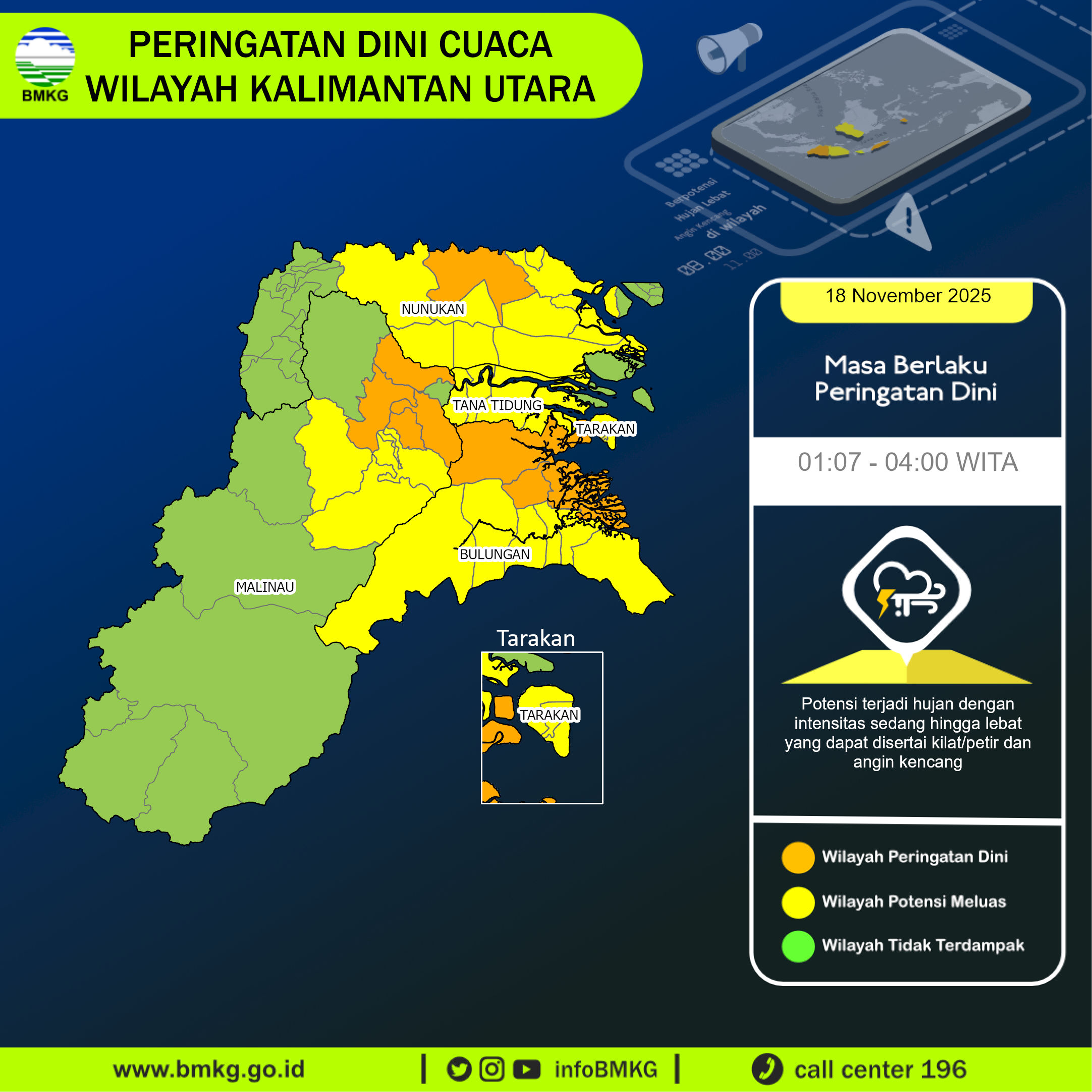 Thunderstorms and heavy rainfall are forecasted to occur starting from 17 November 2025, 21:51 WITA in parts of Kalimantan Utara especially in: Lumbis Ogong, Mentarang, Peso, Peso Hilir. These conditions may lead to reduced visibility, strong winds, and localized flooding. The public is strongly advised to remain vigilant during this period, limit outdoor activities, and take all necessary precautions to ensure safety. Conditions are expected to gradually improve by 18 November 2025, 01:30 WITA.